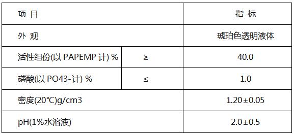 PAPEMP為一代新型水處理劑,具有很高的螯合分散性能和很高的鈣容忍度及優(yōu)異的阻垢性能,該藥劑可作為循環(huán)冷卻水系統(tǒng)的阻垢緩蝕劑,特別適用于高硬度、高堿度、高pH的循環(huán)冷卻水系統(tǒng)和油田水處理。對碳酸鈣、磷酸鈣、硫酸鈣的阻垢性能優(yōu)異,同時可有效地抑制硅垢的形成,且具有良好的穩(wěn)定金屬離子如鋅、錳、鐵的作用。